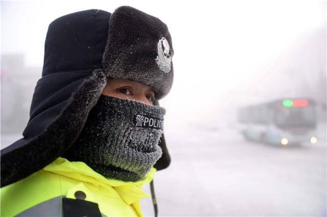 1月24日,一名交警在黑龙江漠河一条主干道上指挥交通,当天的气温低至零下44摄氏度。新华社记者王凯摄