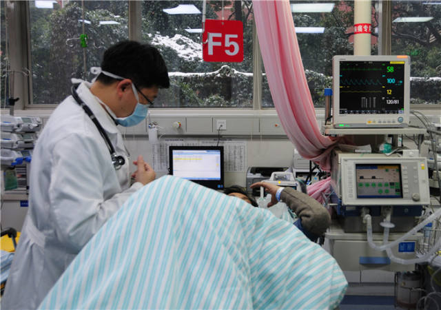 1月31日,浙江大学医学院附属第二医院急诊科抢救室里,急诊科医生丁建波正在查看病人的病情。窗外,灌木已被白雪覆盖。新华社记者马剑摄