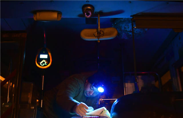 2月1日凌晨,在长春公交集团北达汽车公司雁鸣湖枢纽站,暖车员冯海峰在公交车发车前进行安全复查。新华社记者林宏摄