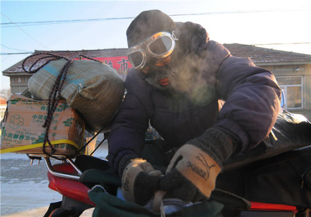1月25日,在黑龙江省牡丹江市林口县柳树镇长岭村,邮递员高山整理快递包裹。当日,黑龙江省牡丹江市林口县最低气温跌破零下30摄氏度。新华社发(张春祥摄)