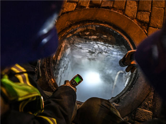 2月1日,国家电投大连大发供热有限公司供暖管道检修工在大连市沙河口区南沙街西南路一处检测井测温。新华社记者潘昱龙摄
