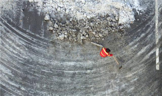 1月25日,建筑工人冒着风雪在上海一市政工程工地进行混凝土浇注施工。新华社记者陈飞摄