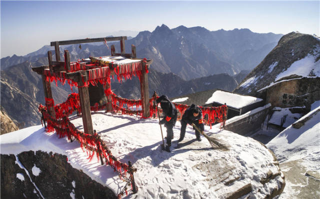 1月31日,陕西华山景区的工作人员在南天门上清理积雪。新华社记者陶明摄
