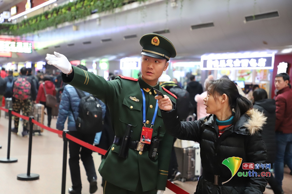 在熙熙攘攘的人群中,一身橄榄绿、一双白手套成为执勤官兵最帅气的标志,当武警战士们抬起手臂指向旅客需要的方向时,这动作帅气洒脱!