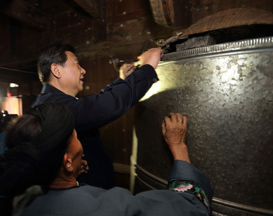 在河北阜平龙泉关镇骆驼湾村困难户唐荣斌家,习近平拿起桌上的药瓶仔细查看,嘱咐老人多多保重身体。