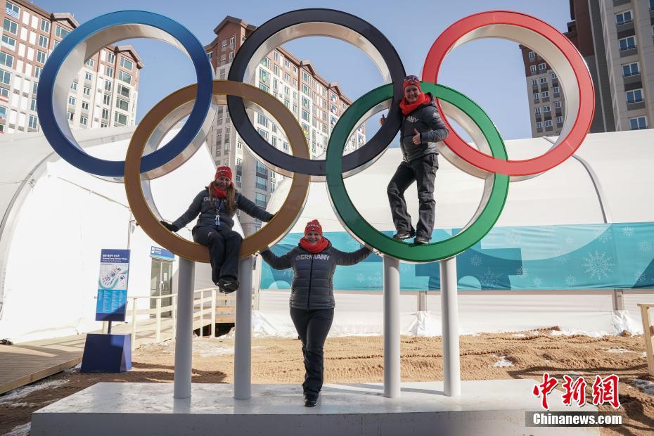2月6日,2018年平昌冬奥会平昌奥运村对媒体开放。据悉,本届冬奥会设置平昌、江陵两处奥运村。平昌奥运村为雪上项目运动员驻地,将接待超过3500名雪上项目的运动员、教练及随行官员。图为三名德国运动员与平昌奥运村五环标志合影。中新社记者 崔楠 摄