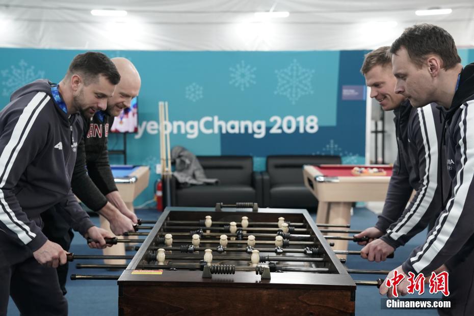 2月6日,2018年平昌冬奥会平昌奥运村对媒体开放。据悉,本届冬奥会设置平昌、江陵两处奥运村。平昌奥运村为雪上项目运动员驻地,将接待超过3500名雪上项目的运动员、教练及随行官员。图为拉脱维亚、加拿大两国运动员在平昌奥运村中进行休闲活动。中新社记者 崔楠 摄