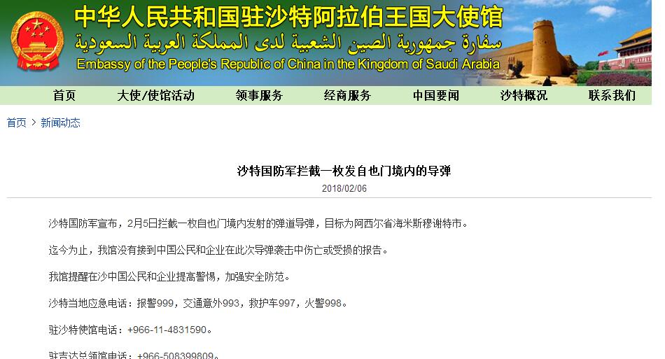 据中国驻沙特阿拉伯王国大使馆网站消息,沙特国防军宣布,2月5日拦截一枚自也门境内发射的弹道导弹,目标为阿西尔省海米斯穆谢特市。迄今为止,中使馆没有接到中国公民和企业在此次导弹袭击中伤亡或受损的报告。