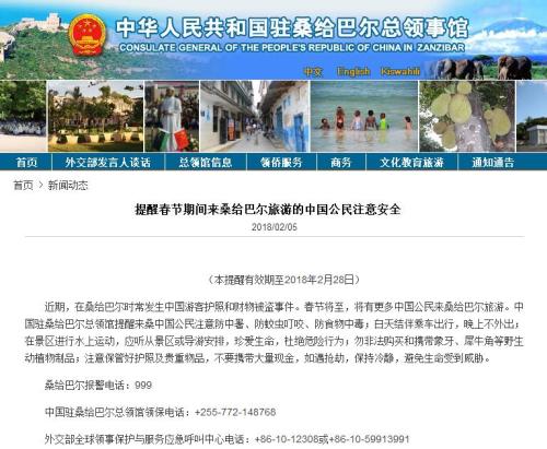 中国驻桑给巴尔总领馆提醒赴桑给巴尔的中国公民,注意防中暑、防蚊虫叮咬、防食物中毒。白天结伴乘车出行,晚上不外出。在景区进行水上运动,应听从景区或导游安排,珍爱生命,杜绝危险行为。