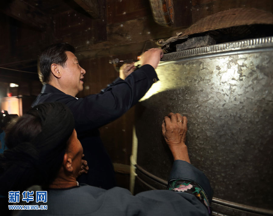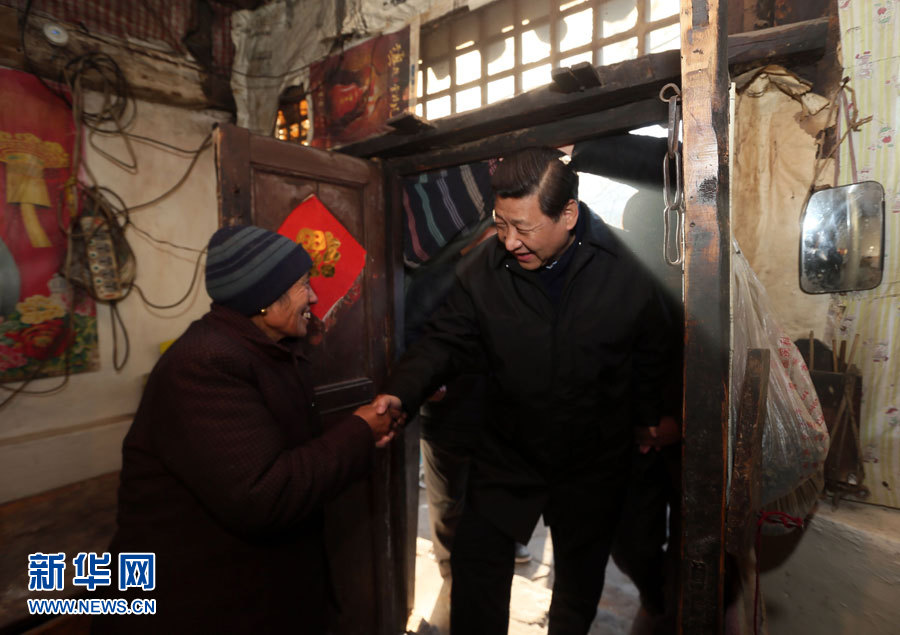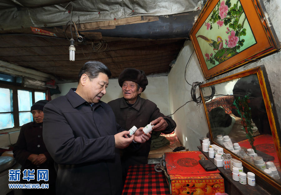 在河北阜平龙泉关镇骆驼湾村困难户唐荣斌家,习近平拿起桌上的药瓶仔细查看,嘱咐老人多多保重身体。