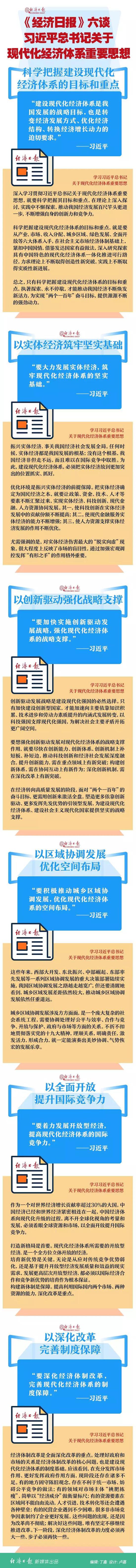 习近平总书记在主持中央政治局第三次集体学习时强调,建设现代化经济体系是我国发展的战略目标,也是转变经济发展方式、优化经济结构、转换经济增长动力的迫切要求。深入学习贯彻习近平总书记关于现代化经济体系重要思想,就要科学把握其目标和重点,在理论上深入探讨,实践中不懈探索,推动我国经济发展百尺竿头更进一步,不断增强自身的创新力和竞争力。《经济日报》近日在一版连续刊发6篇文章,对习近平总书记这一重要思想进行系统阐释。