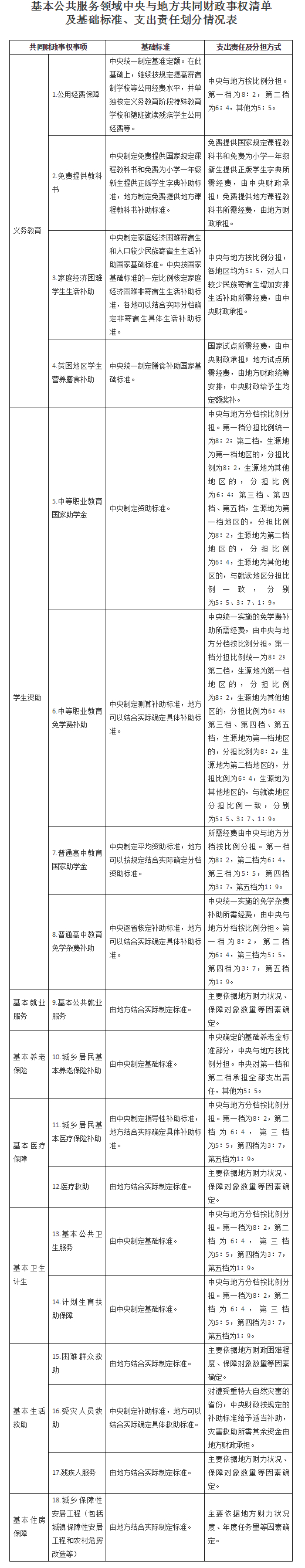 附:基本公共服务领域中央与地方共同财政事权清单及基础标准、支出责任划分情况表。来自中国政府网
