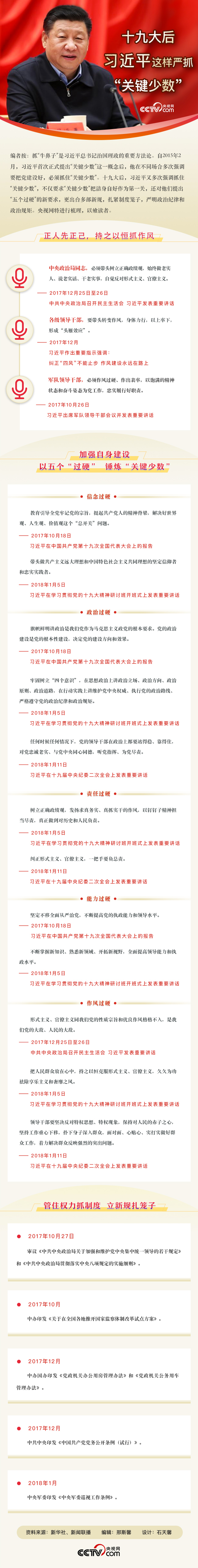 央视网消息:抓“牛鼻子”是习近平总书记治国理政的重要方法论。自2015年2月,习近平首次正式提出“关键少数”这一概念后,他在不同场合多次强调要把党建设好,必须抓住“关键少数”。十九大后,习近平又多次强调抓住“关键少数”,不仅要求“关键少数”把洁身自好作为第一关,还对他们提出“五个过硬”的新要求,更出台多部新规,扎紧制度笼子,严明政治纪律和政治规矩。央视网特进行梳理,以飨读者。