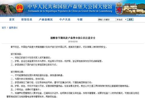 据中国驻卢森堡大使馆网站消息,春节将至,驻卢森堡大使馆提醒计划赴卢旅行的中国公民提高防范意识,切实保障人身和财物安全。