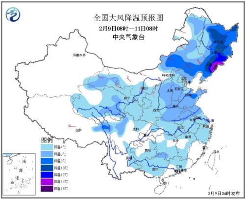 预计未来48小时,川西高原北部、甘肃北部、青海东部、华北、内蒙古中东部、东北地区大部、黄淮等地气温将下降6~8℃,部分地区降温幅度可达10~12℃,局地14℃以上,上述大部地区有4~6级偏北风,阵风可达7~8级;期间,最低气温0℃线将南压至江南东部至四川东北部、云南北部等地,-10℃线位于华北北部-西北地区东部一线。为此,中央气象台2月9日06时继续发布寒潮蓝色预警。