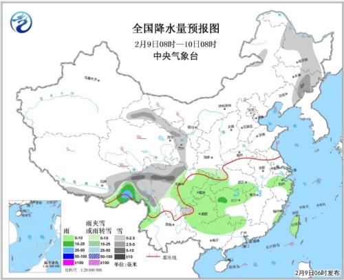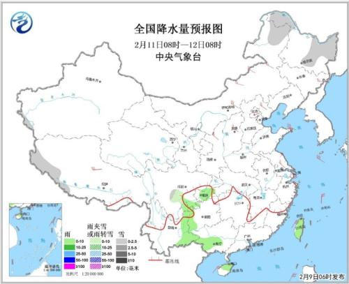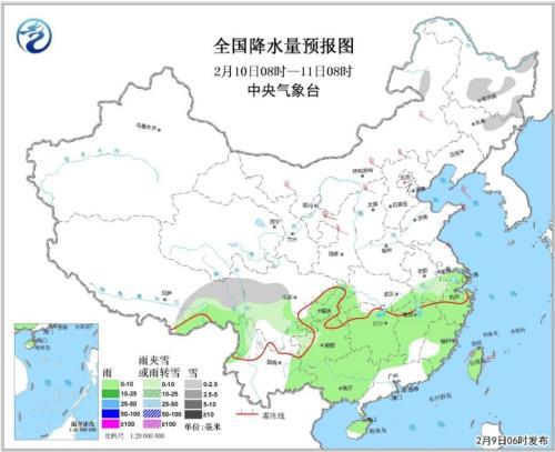 图3全国降水量预报图(2月9日08时-2月10日08时)