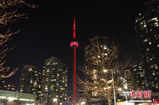 当地时间2月8日晚,在中国农历小年夜,加拿大地标性的观光点、位于多伦多的加拿大国家电视塔连续第四年用灯光披上红装,迎接即将到来的农历戊戌狗年新春。中新社记者余瑞冬 摄