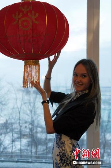 当地时间2月8日,中国农历小年夜,加拿大尼亚加拉大瀑布景区一家酒店身穿中式旗袍的工作人员,在当晚大瀑布点亮“中国红”的仪式之前挂上中国红灯笼,迎接即将到来的农历戊戌狗年新春。中新社记者余瑞冬 摄