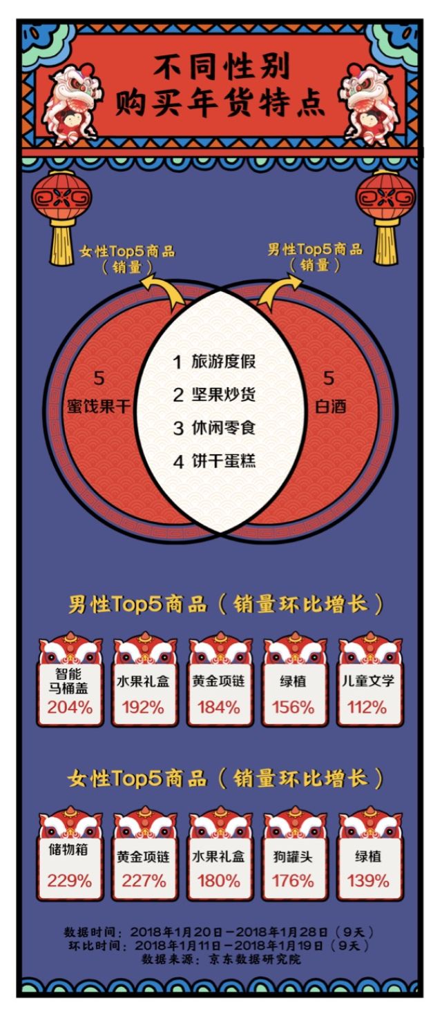 购买年货的男女比例如何?喜好的年货有何不同?数据显示,今年购买年货的女性占比相较于非年货节期间京东全站的女性用户高出了8%,在年货的采买上,女性扮演了更重要的角色。
