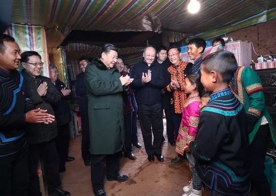 2月11日上午,习近平在凉山彝族自治州昭觉县三岔河乡三河村贫困户吉好也求家中看望,听10岁小女孩吉好有果唱《国旗国旗真美丽》。 新华社记者 鞠鹏 摄