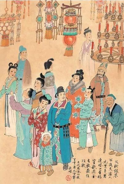 正月十五日是一年中第一个月圆之夜,故称『元(月)宵(夜)』。早在汉代已有庆贺元宵之俗。苏味道的《正月十五日夜》诗:『火树银花合,星桥铁锁开。暗尘随马去,明月逐人来。游伎皆浓李,行歌尽落梅。金吾不禁夜,玉漏莫相催。』成为元宵诗经典之作。唐睿宗时元夕作灯树高二十丈,燃灯五万盏,号为『火树』。『金吾不禁夜』是说京城破例取消夜间戒严,允许市民逛灯三整夜,又称『放灯』。