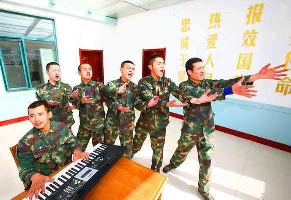 战士们利用空闲时间自编自导排练节目、放声歌唱。陈小强 摄