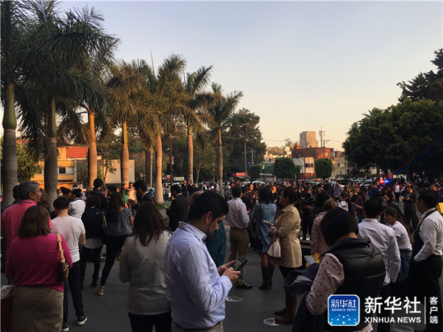 2月16日,人们在墨西哥首都墨西哥城一商场前的广场避险。新华社记者许睿摄