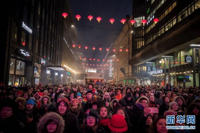 2月15日,在芬兰首都赫尔辛基,烟花在北京时间16日零时燃放,与中国同步庆新春。第12届“欢乐春节·赫尔辛基庙会”15日下午在芬兰首都赫尔辛基举行,吸引大量民众参加。图片来源:新华网