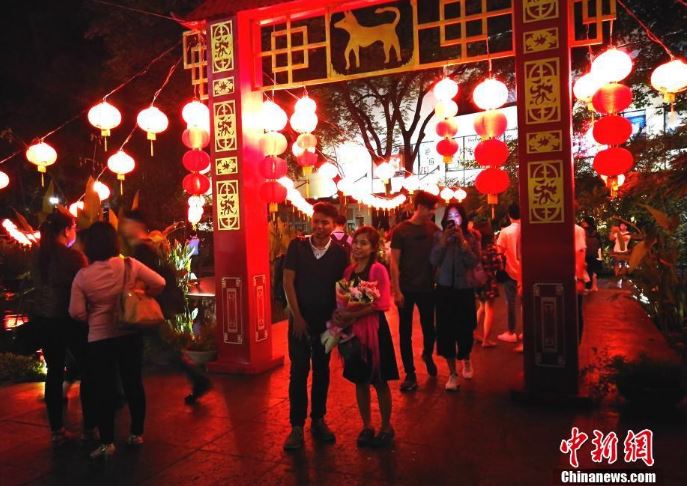 2月14日,情人节与中国农历新年接踵而至,菲律宾首都马尼拉CBD马卡蒂,情人们在中国红灯笼下约会。图片来源:中新网
