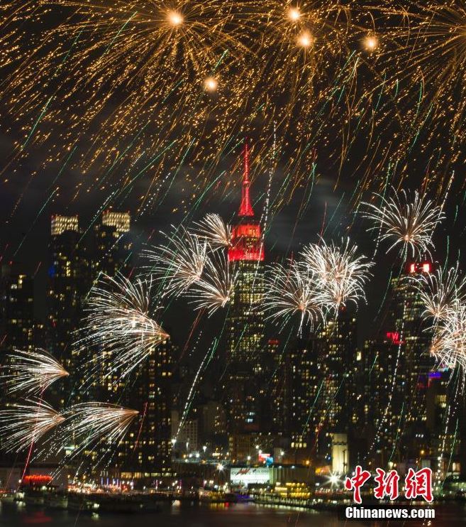 当地时间2月14日晚,中国驻纽约总领事馆前的哈德逊河上空燃放起焰火,庆祝中国狗年春节。图片来源:中新网