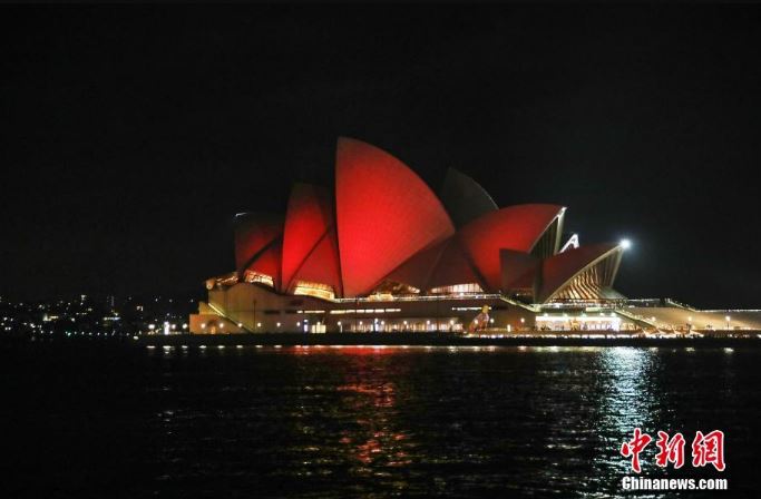 2月15日夜,悉尼歌剧院点亮“中国红”,庆祝中国农历新年。图片来源:中新网
