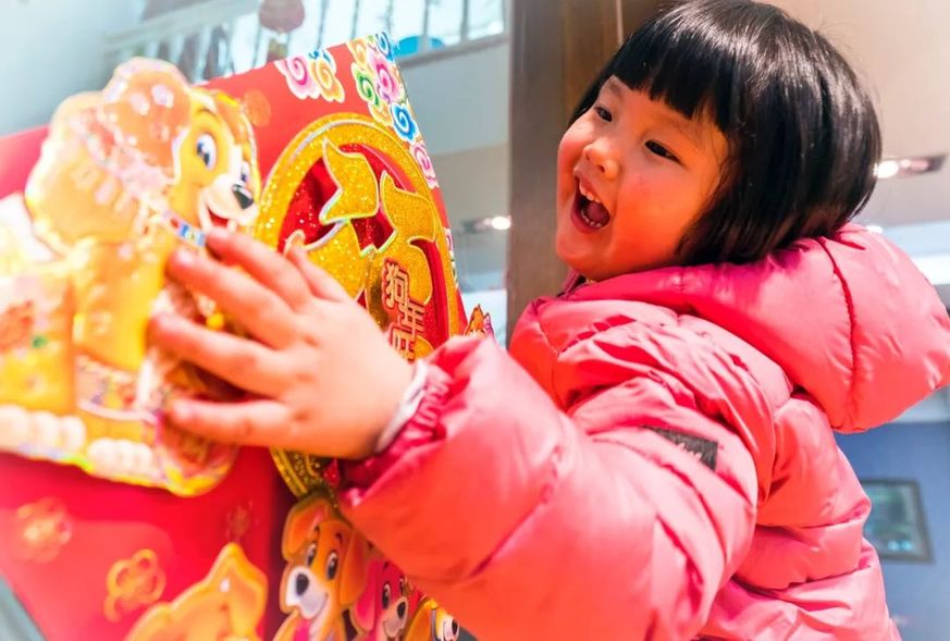 2018年2月15日。湖北恩施。除夕之夜,四岁的小朋友爬到沙发上,抚摸大红的福字和萌狗生肖像,童趣十足。山里人 摄