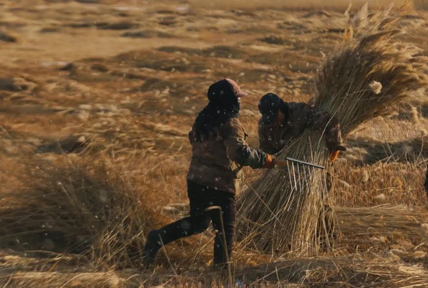 2018年2月10日。黑龙江齐齐哈尔。逆风而上,芦苇漫天飘絮,人们捂住鼻嘴收割遍地金苇。Sufi 摄