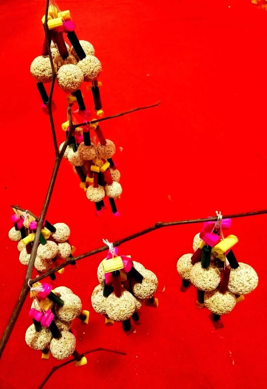 2018年2月3日。山东滨州。这种又香又甜的糖球用彩丝串成,又称“欢喜团”,寓意“团圆快乐,合家欢喜”,深受当地人喜爱。左石摄