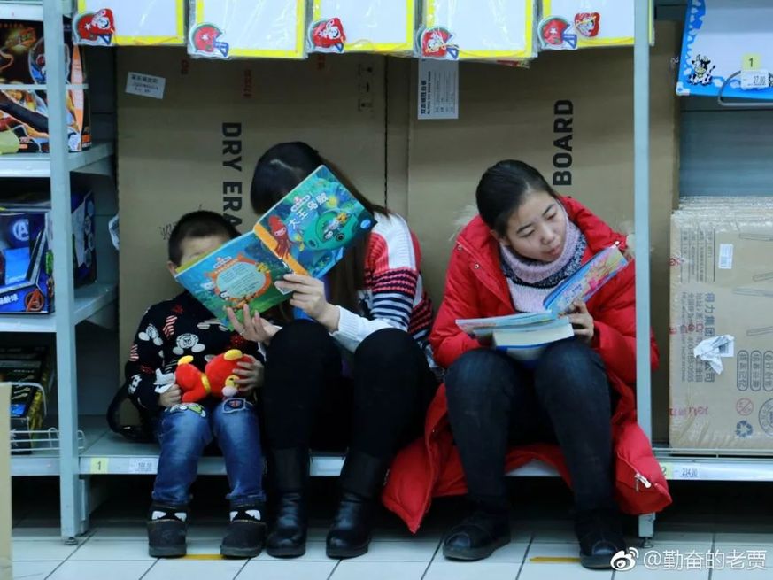 2018年2月3日。超市里面采购年货的人群熙熙攘攘,他们却在货架下静静地读书。贾国辉 摄