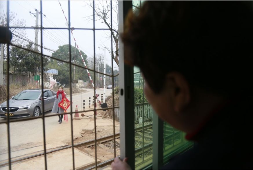 2018年2月15日。江西崇仁。窗外,女儿回到父母常年看守的铁路道口,手提中国结,挥舞着花束:“妈,我回来了!”窗内,母亲惊喜地推开窗:“女儿回来啦!”嗯叮摄