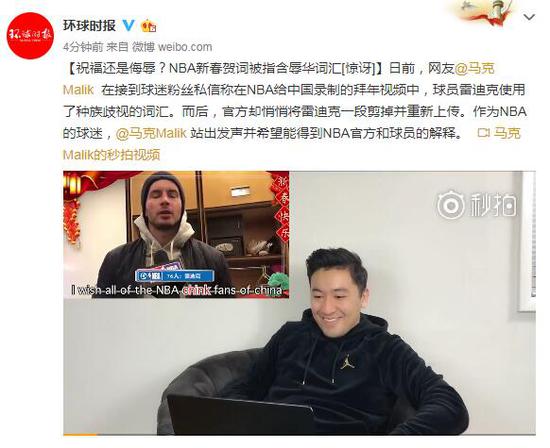 日前,网友@马克Malik 在接到球迷粉丝私信称在NBA给中国录制的拜年视频中,球员雷迪克使用了种族歧视的词汇。而后,官方却悄悄将雷迪克一段剪掉并重新上传。作为NBA的球迷,@马克Malik 站出发声并希望能得到NBA官方和球员的解释。