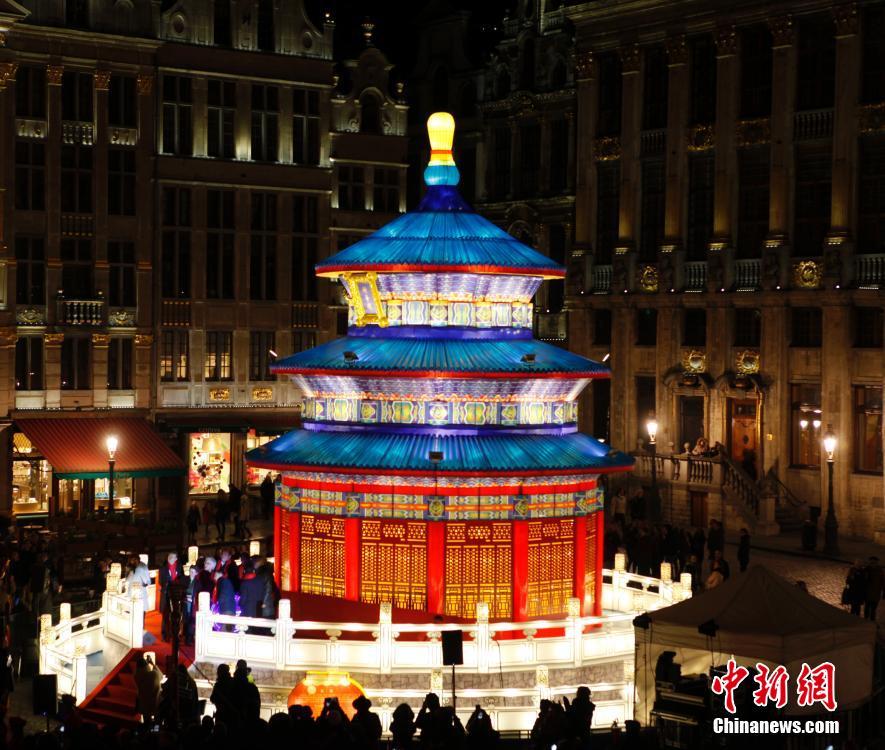 当地时间2月22日晚,中欧双方在比利时地标布鲁塞尔大广场举行元宵灯展亮灯仪式——随着正月十五的临近,开始在号称“欧洲心脏”的比利时闹花灯。图为久负盛名的四川自贡天坛彩灯。中新社记者 德永健 摄