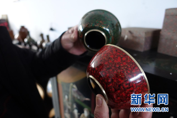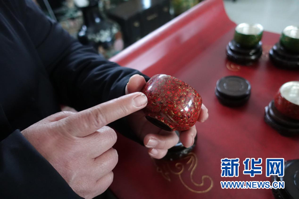 奚建辉介绍“菠萝漆”技艺制成的茶碗。新华网 卓越 摄