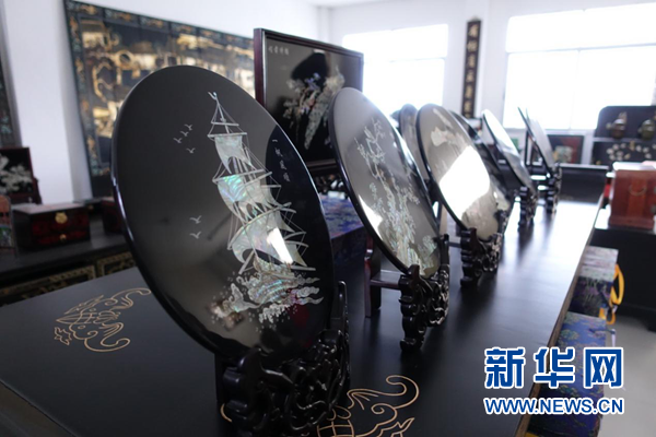 徽漆展厅里陈列的徽漆贝壳画作品。新华网 卓越 摄