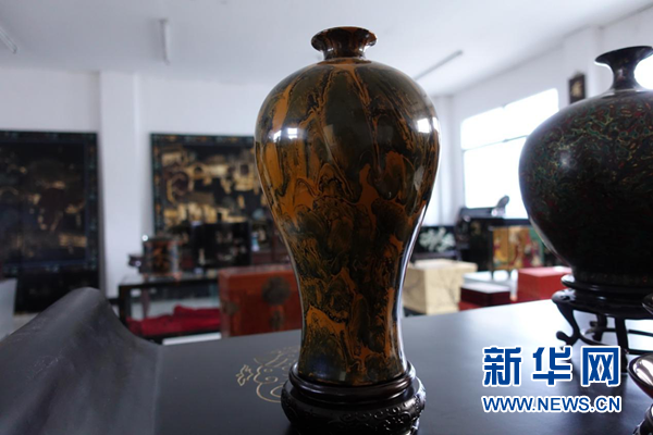 “流淌漆”技艺制作的花瓶。“流淌漆”即通过变换液态漆的湿度及流下的角度,使之形成自然的漆面花纹。新华网 卓越 摄