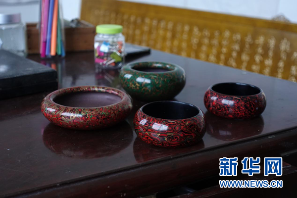 “菠萝漆”技艺制成的茶碗表面,有形似涟漪的花纹。新华网 卓越摄