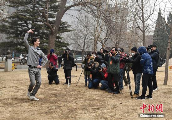 2月27日,北京电影学院2018年艺考初试开考,校园内云集众多高颜值的帅哥美女。图为考生考场外为媒体记者表演才艺。中新网记者 翟璐 摄
