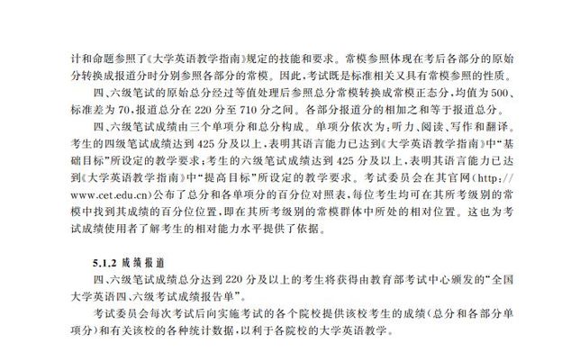 中国青年报(ID:zqbcyol)注意到,《全国大学生英语四、六级考试大纲》(2016修订版)显示,“考生的四级笔试成绩达到425分及以上,表明其语言能力已达到《大学英语教学指南》中‘基础目标’所设定的教学要求;考生的六级笔试成绩达到425分及以上,表明其语言能力已达到《大学英语教学指南》中‘提高目标’所设定的教学要求。”