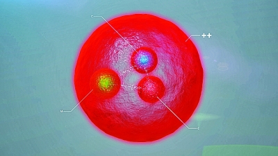 欧洲核子研究中心于2017年7月6日宣布,来自大型强子对撞机上底夸克探测器国际合作组的科学家们发现了一种被称为双粲重子的新粒子。与质子和中子类似,新发现的双粲重子由三个夸克组成,但其夸克组分不同:质子由两个上夸克和一个下夸克组成,中子由两个下夸克和一个上夸克组成,而双粲重子则由两个较重的粲夸克和一个上夸克组成。由清华大学高原宁领导的中国研究团队通过与国内理论家密切合作,主导了此次双粲重子发现的物理分析工作,对该粒子的发现作出了关键性贡献。见图②