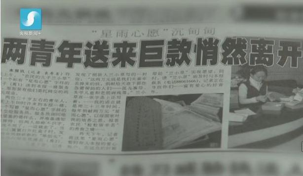 2002年11月17日,两位男青年来到温州晚报送来一个包裹,里面装着2万元现金,并留下一封信:“这两万元是我们辛苦挣来的,捐给急需帮助的人……希望用33年时间,每年捐献2万元‘星雨心愿’善款,以报答国家对我们的培养之恩,报答农民‘粒粒皆辛苦’的养育之情……”此后,在每年11月中下旬,这个化名“兰小草”的好心人都会托人送来2万元捐款,一送就是15年。