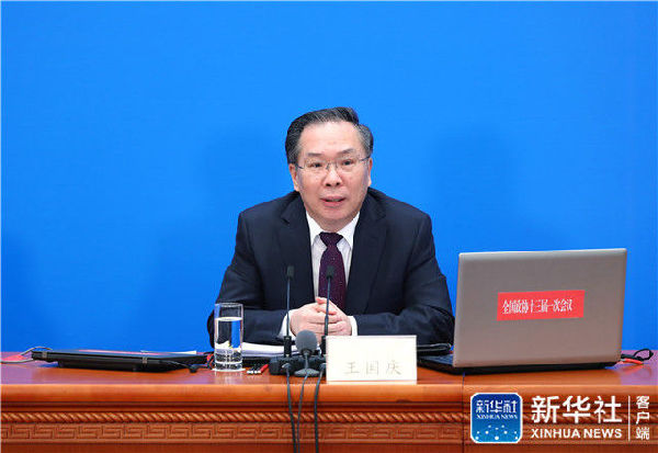 3月2日,全国政协十三届一次会议新闻发布会在北京人民大会堂举行,大会新闻发言人王国庆介绍会议有关情况并回答中外记者提问。新华社记者张玉薇摄