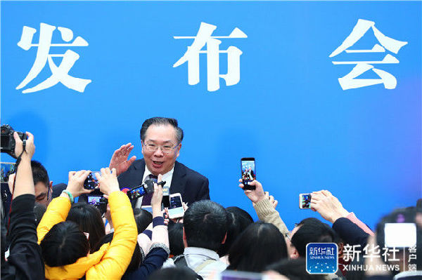 3月2日,全国政协十三届一次会议新闻发布会在北京人民大会堂举行,大会新闻发言人王国庆介绍会议有关情况并回答中外记者提问。这是王国庆在发布会结束后和记者交流。新华社记者张玉薇摄