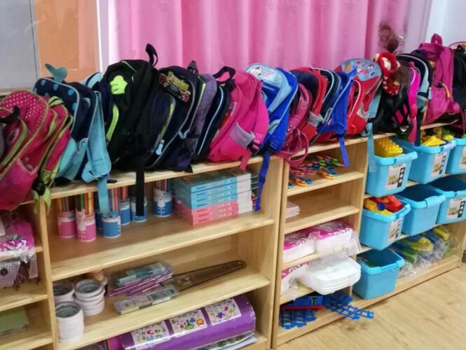孩子们摆放整齐的学习用品和玩具。