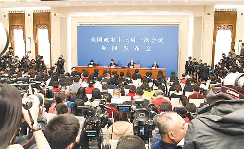3月2日,全国政协十三届一次会议新闻发布会在北京人民大会堂举行,大会新闻发言人王国庆向中外媒体介绍会议有关情况并回答记者提问。右图为经济日报·中国经济网记者廉丹就经济发展问题提问。经济日报-中国经济网记者高兴贵摄